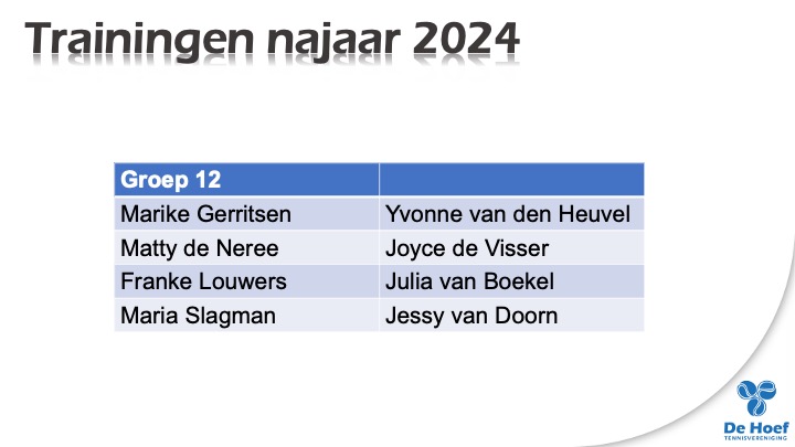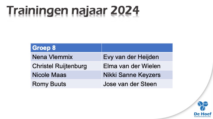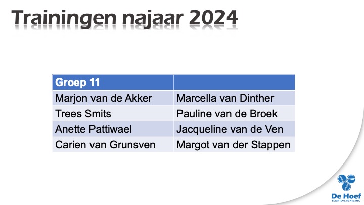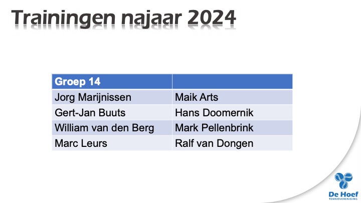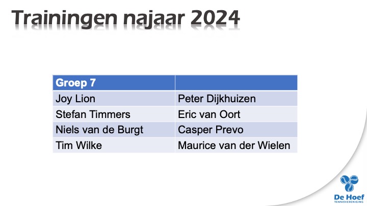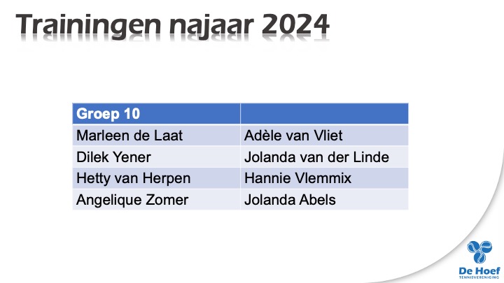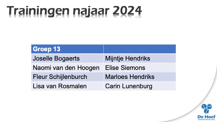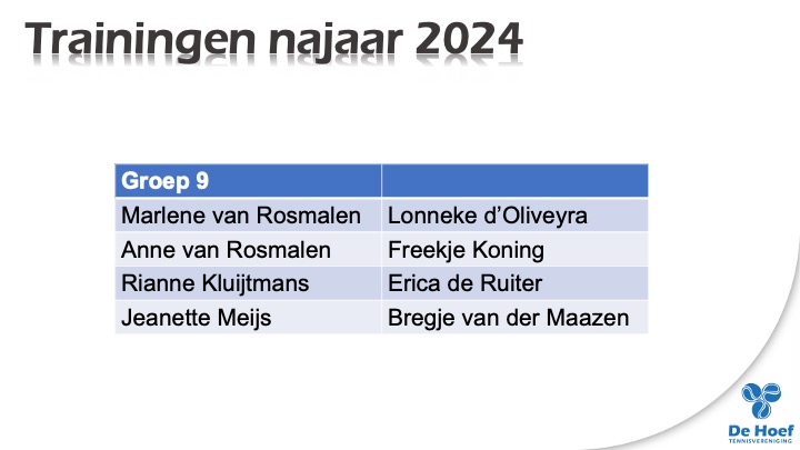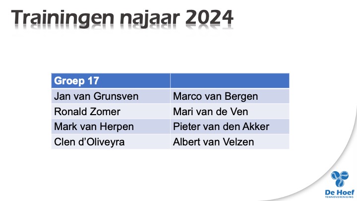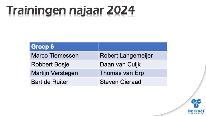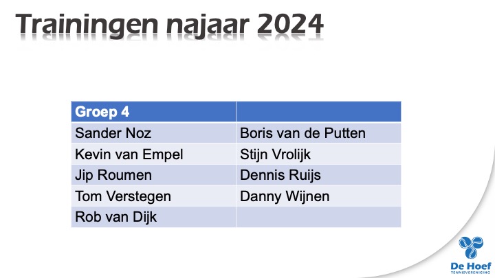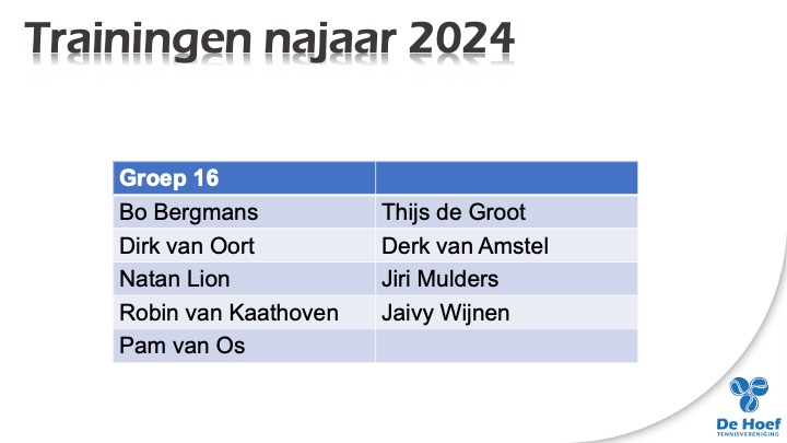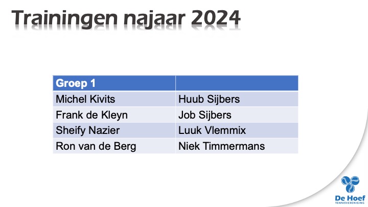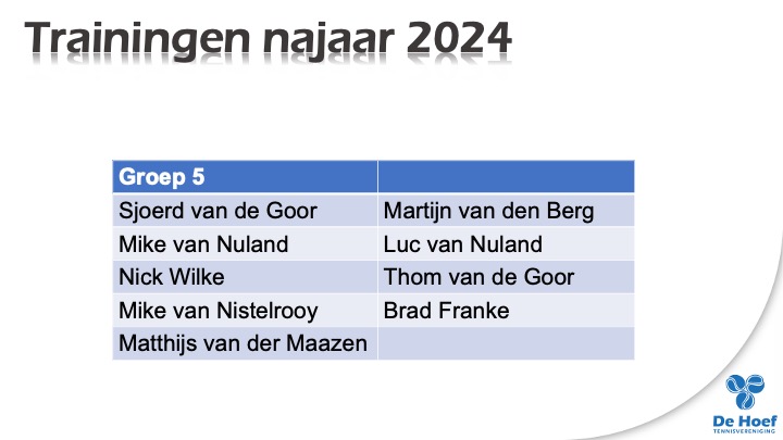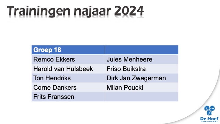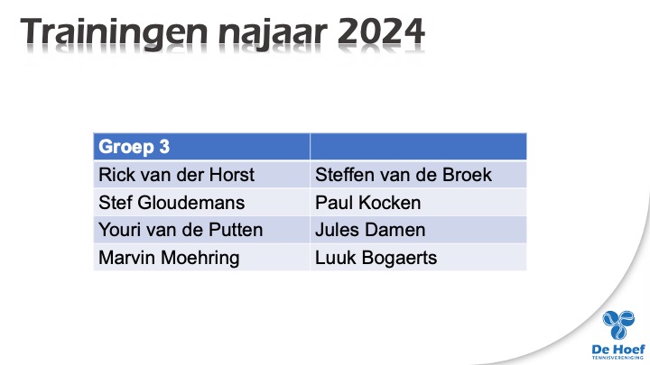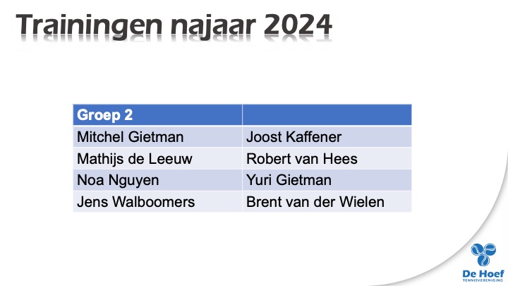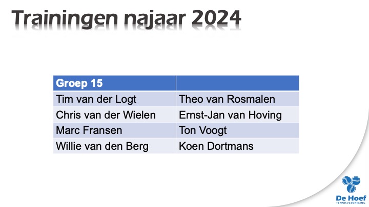 Hieronder vind je de trainingsindeling terug van de trainingen voor aankomend najaar. Joffe van der Heijden Tennis en de trainingscoördinator van TV De Hoef hebben deze groepen met zorg samengesteld en wij hopen dat jullie een beter najaar krijgen qua weer dan afgelopen voorjaar om te trainen en plezier te vinden in onze mooie tennissport.